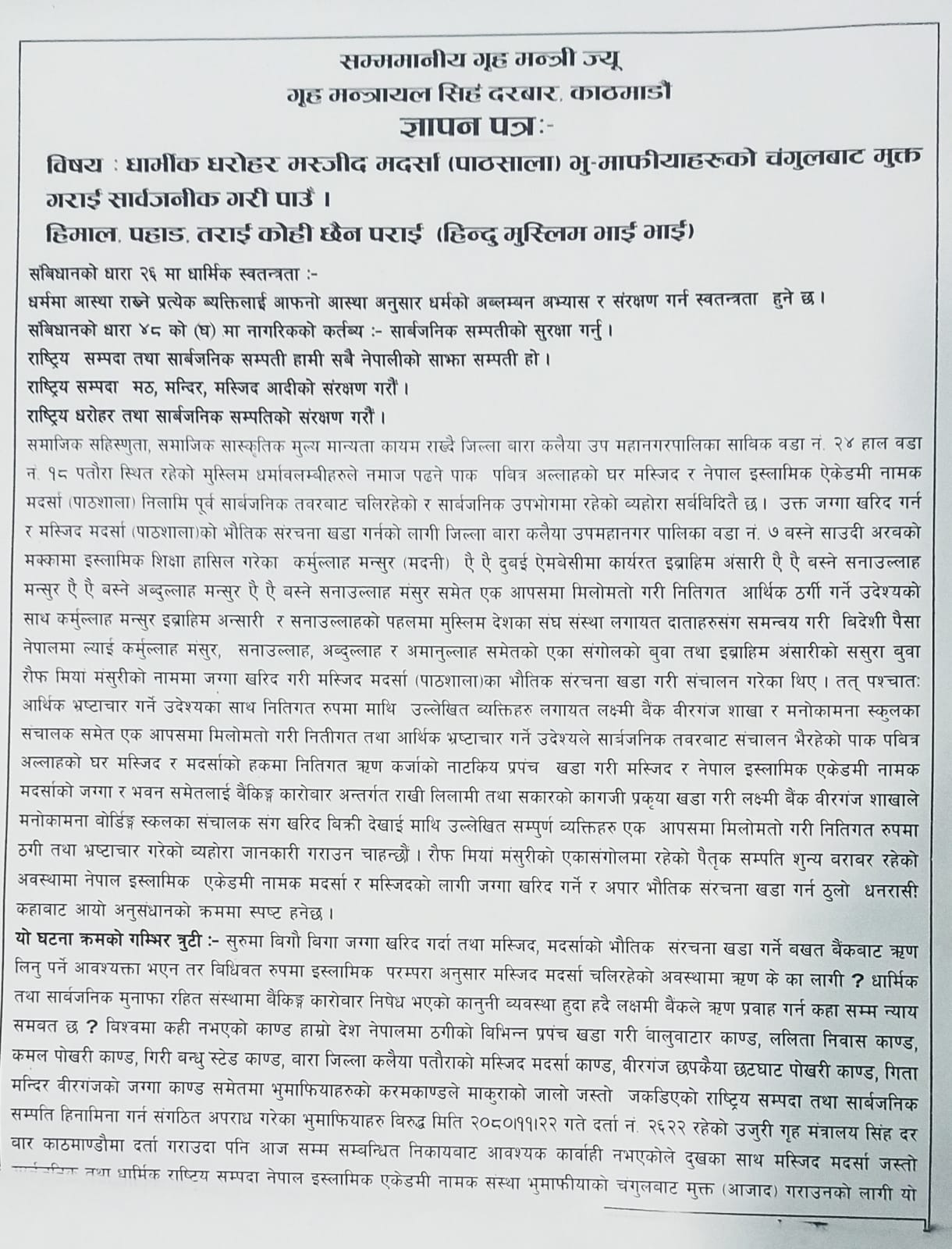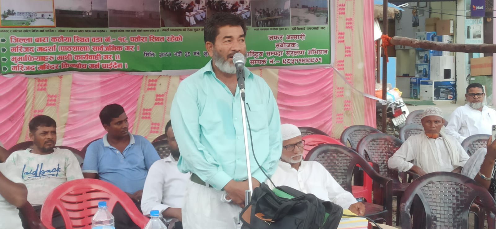अभियानको अध्यक्षता गर्दै राष्ट्रिय सम्पदा तथा सार्बजनिक सम्पत्ती संरक्षण अभियानका अध्यक्ष जफर अंसारीले बिभिन्न प्रपञ्च खडा गरी माकुराको जाल जस्तो रहेको भूमाफियाहरुले सार्बजनिक जग्गा, धार्मिक स्थलहरुलाई मालपोत कार्यालयका कर्मचारीहरुलाई रकमको बलमा र पावरको प्रयोग गरी आफनो प्रभावमा पारी जस्तो सुकै काम गराउन सफल हुदै आएका छन ।