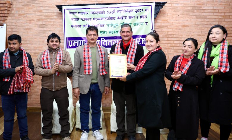 नेपाल पत्रकार मञ्चले नेपाल पत्रकार महासंघको २७ औँ महाअधिवेशनमा निर्वाचित राष्ट्रिय परिषद सदस्य एवं प्रदेश परिषद सदस्यहरूलाई प्रमाण पत्र हस्तान्तरण गर्न आयोजित समारोहमा वक्ताहरूले त्यस्तो जोड़ दिनु भएको हो ।