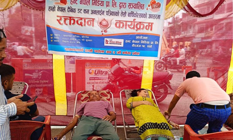 वीरगंज, हट नेपाल मिडियाले प्रा.लि. द्वारा संचालित हाम्रो नेपाल दैनिक डटकम अनलाईन पत्रिकाको तेश्रो बार्षिकउत्सवको अवसरमा वीरगंजको घन्टाघरमा रक्तदान कार्यक्रमको आयोजना गरि सम्पन्न भएको छ ।