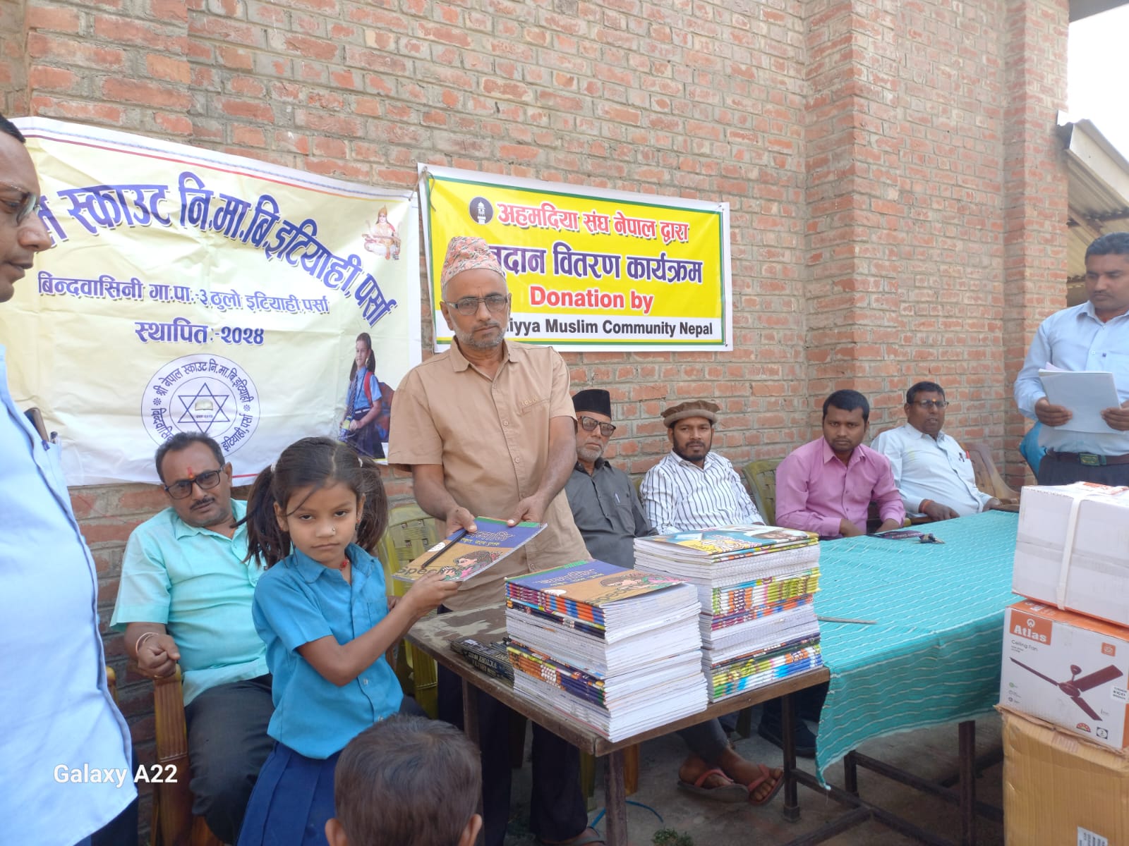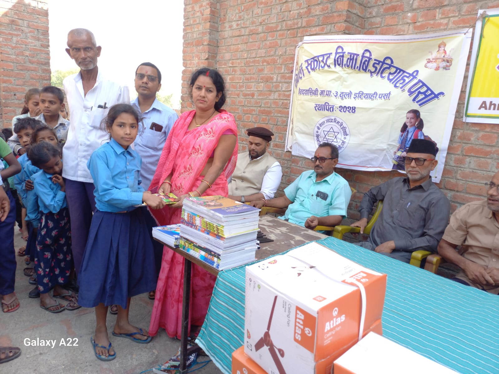 पर्साको बिन्दवासिनी गाउँपालिका वडा न ३ टोल इटियाही स्थित श्री नेपाल स्काउट नि.मा.बि .मा आज अहमदिया संघ नेपालले एक कर्यक्रम का बिच १० थान पंखा तथा शैक्षिक सामग्री वितरण गरिएको छ |
